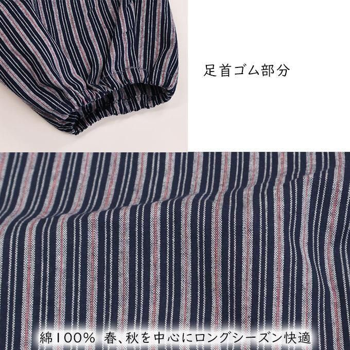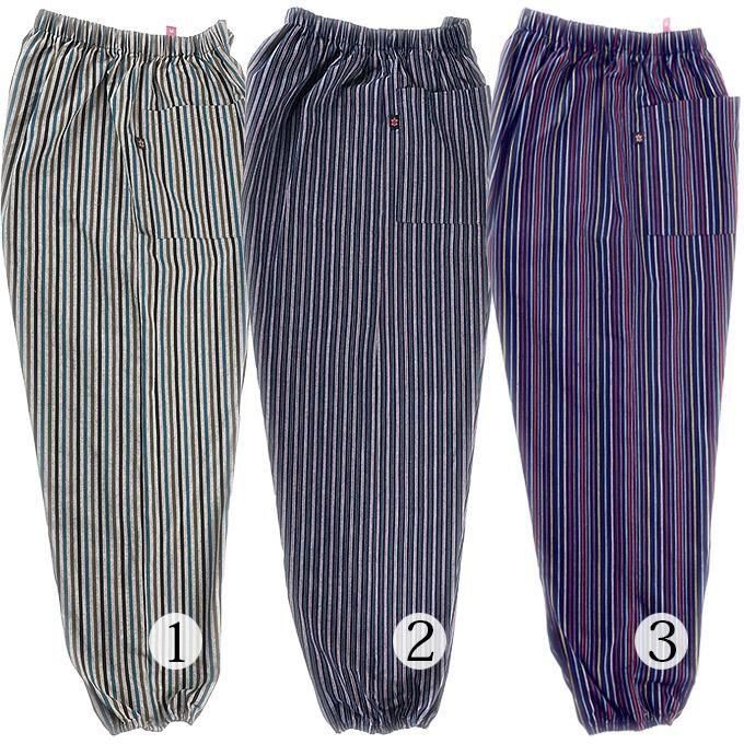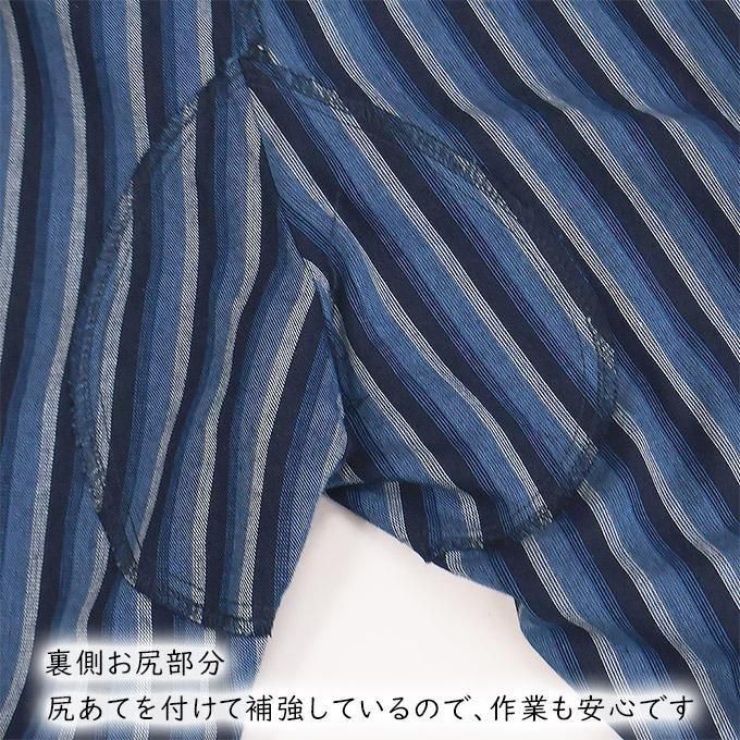 ゆったり動きやすい綿100%縦縞の日本製もんぺ。股上をしっかりとっているのでお腹や背中が出にくく安心。お尻部分は尻当を付けて補強しています。 ウエスト部分はゴム入替口が付いて交換が可能です。綿100%の生地は春秋を中心にロングシーズン快適。農作業、園芸、ガーデニングなど実用性、作業性に優れたもんぺです。